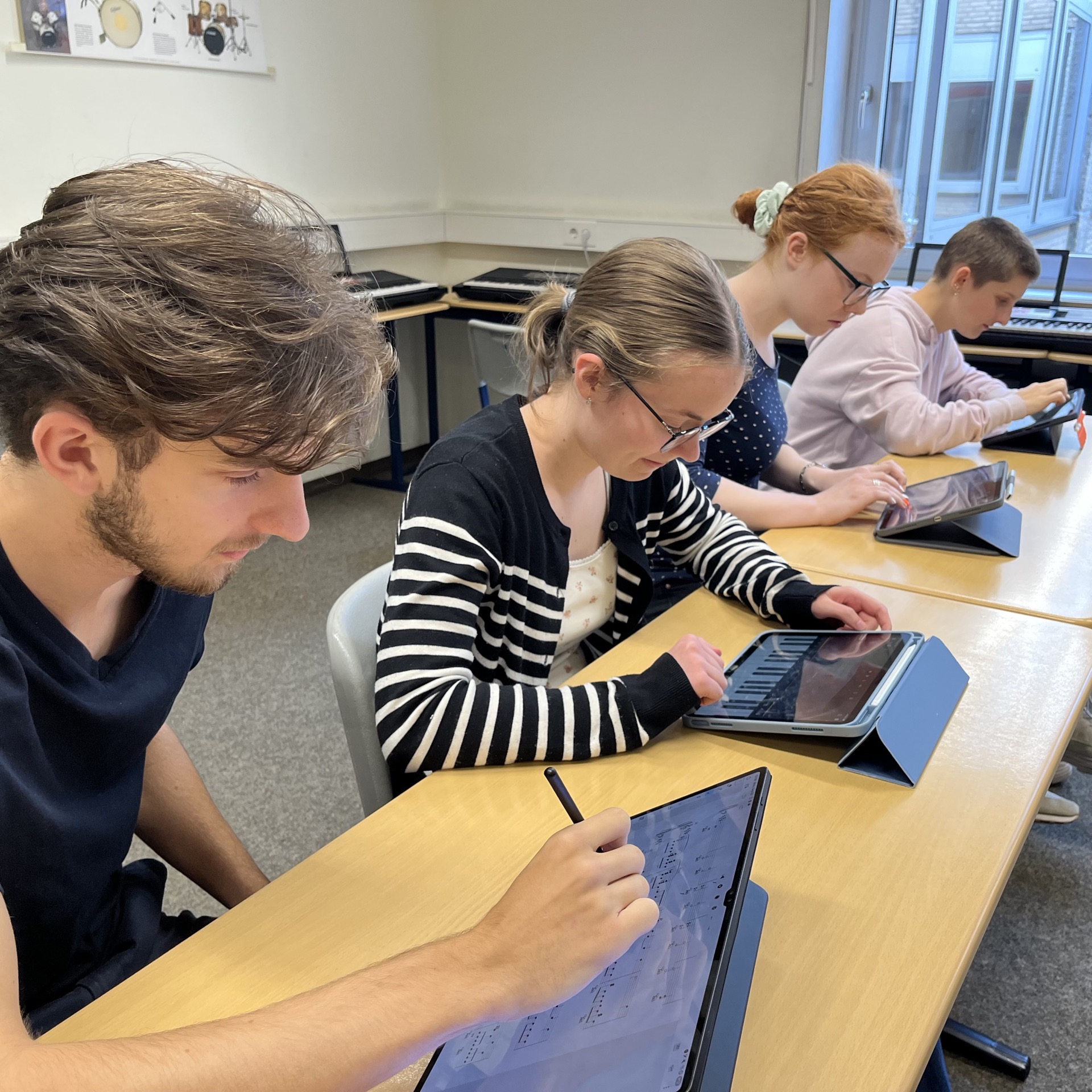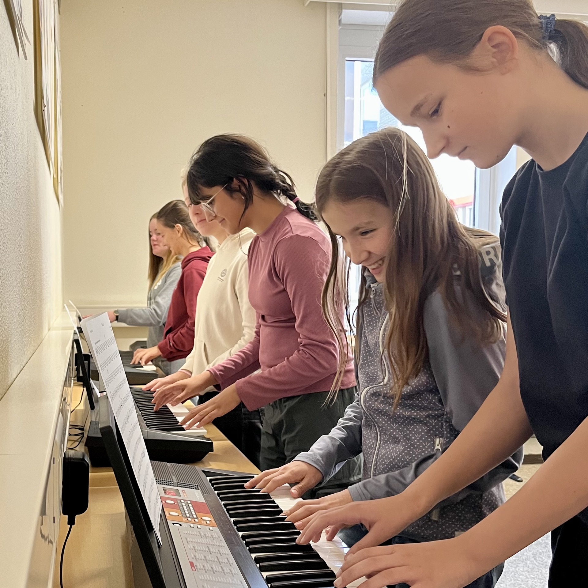 Unser Unterricht orientiert sich am Niedersächsischen Kerncurriculum und verbindet Praxis und Theorie miteinander. Die Schülerinnen und Schüler singen, spielen Instrumente und bewegen sich zu Musik. Darüber hinaus lernen sie, Musik bewusst zu hören, zu beschreiben, zu untersuchen und zu deuten. Dabei geht es sowohl um musikalische Gestaltungsmittel wie beispielsweise Klang, Rhythmus oder Harmonik als auch um die Rolle von Musik in Verbindung mit Sprache, Bild, Szene und Film – sowie um ihre historische und gesellschaftliche Bedeutung. Digitale Medien wie Tablets unterstützen sie dabei, beispielsweise beim Komponieren oder Arrangieren von Musikstücken.