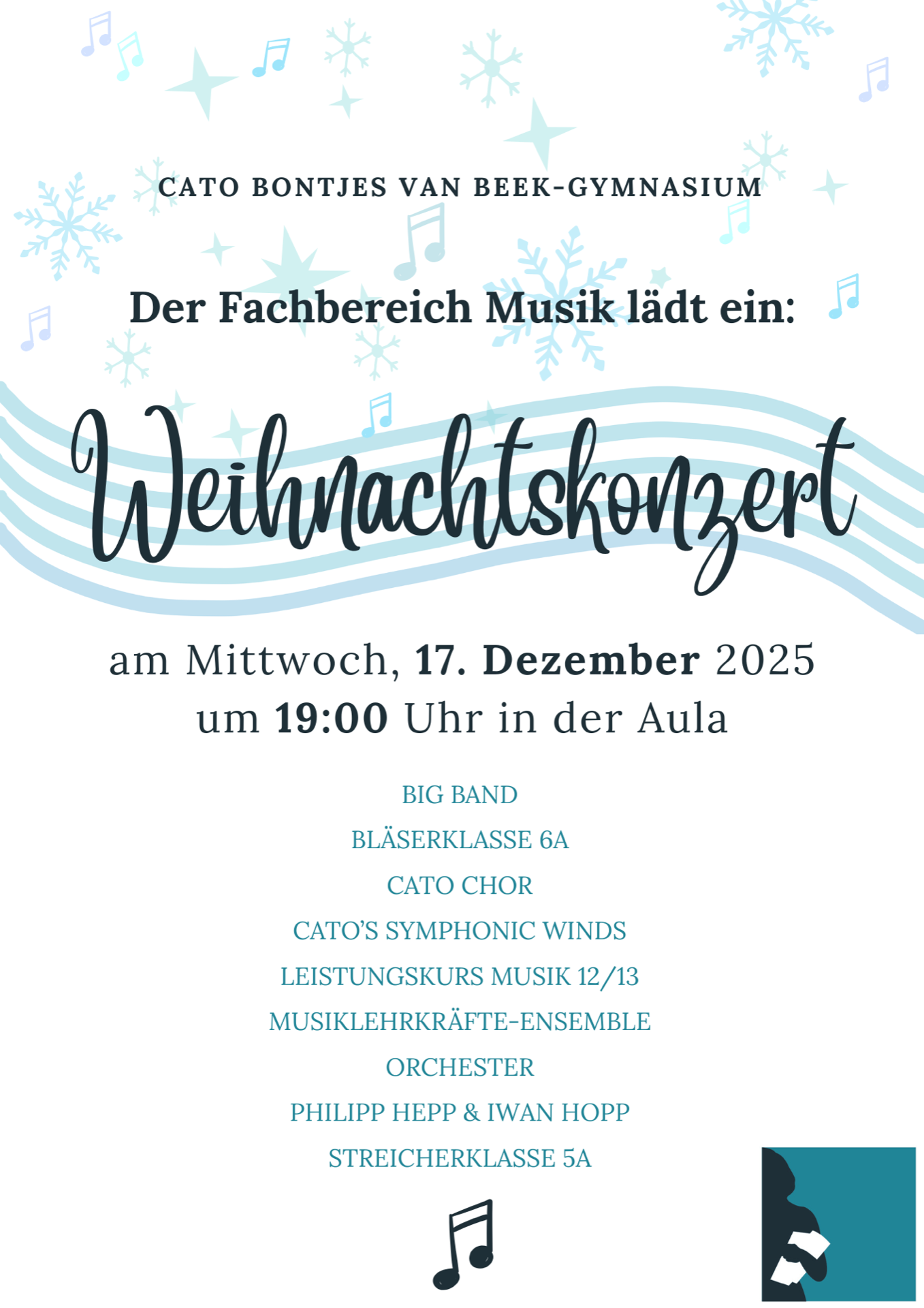 Der Fachbereich Musik lädt herzlich zum diesjährigen Weihnachtskonzert ein. Es findet am Mittwoch, den 17. Dezember 2025, um 19:00 Uhr in unserer Aula statt. Der Eintritt ist frei. Wir freuen uns auf ein zahlreiches Publikum!